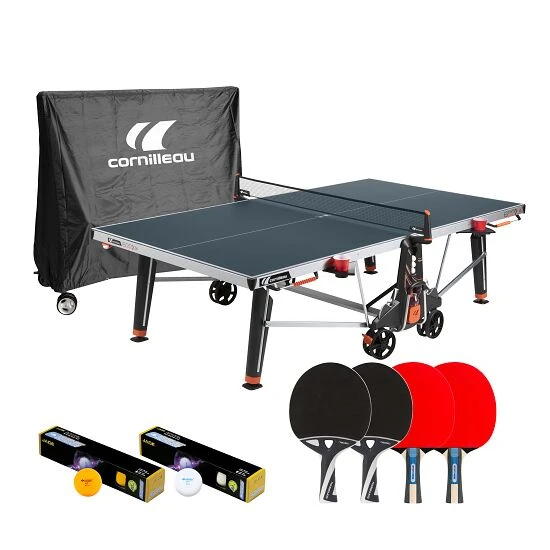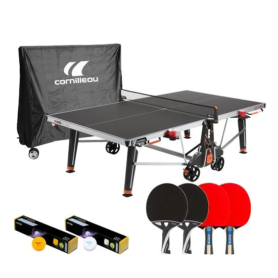 Mittelpunkt des Cornilleau Tischtennis-Set „600X“ ist der robuste Tischtennis-Tisch „600X“. Dieser überzeugt mit zahlreichem Zubehör wie Flaschenhalter, Punktezähler, Ballspender und Co. Obendrein bietet die TT-Platte eine ausgezeichnete Qualität des Rückpralls und perfekter Spin Spin-Reaktion – dadurch kommen auch anspruchsvolle Spieler voll auf ihre Kosten. Zusätzlich enthält das Set jeweils 2 Tischtennisschläger für den Indoor- und Outdoor-Einsatz, sowie 12 Tischtennisbälle und eine Abdeckhaube.