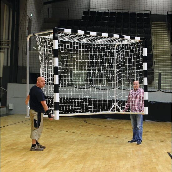 Das Handballtor ist aus AluminiumAluminium ist ein korrosionsbeständiges und pflegeleichtes Leichtmetall, welches für den vielfältigen Einsatz im Innen- und Außenbereich geeignet ist. Aufgrund der hohen Elastizität und des nur geringen Gewichts, ist es eines der am häufigsten verwendeten Gebrauchsmaterialien. gefertigt und hat einen vollverschweißten, stabilen Rahmen. Das Besondere an diesem Tor ist sein vollflächig beklebter Torrahmen. Hierbei umschließen die farblich abgesetzten Felder den gesamten Torrahmen, sodass keine sichtbaren Aluminiumstellen zu sehen sind. Die besonders dicke UV-resistente Folie sorgt für minimierte Kratzeranfälligkeit und Rostbildung auf den Profilen und kann bei möglichem Verschleiß problemlos gewechselt werden. Wir liefern die Oberfläche vollständig beklebt in Schwarz-Weiß, Rot-Weiß oder Blau-Weiß. Andere Farbkombinationen auf Anfrage lieferbar.