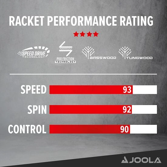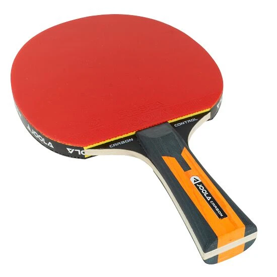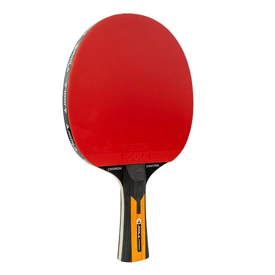 Der Joola Tischtennisschläger „CarbonCarbon ist ein aus Kohlenstoff-Fasern verstärkter Kunststoff. Aufgrund des geringen Gewichts und der besonders hohen Festigkeit findet es häufig Verwendung, wenn vom Material eine hohe Belastbarkeit bei gleichzeitiger Leichtigkeit verlangt wird. Eine weitere Eigenschaft ist die gute Temperatur- und Wetterbeständigkeit. Control“ kommt mit einer konkaven Griff-FormMan unterscheidet zwischen geraden, konkaven, anatomischen oder konischen Griffen. Tischtennis-Schläger mit geradem Griff kann man leichter zwischen Vorhand und Rückhand wechseln und sind daher bei Defensivspielern beliebt. Konkave, anatomisch oder konische Formen liegen dagegen sicherer in der Hand und eignen sich für offensive Spieler und Einsteiger.. Dank der Herstellung aus carbonverstärktem Holz punktet er mit einer sicheren und leichten Ballführung. Darüber hinaus verleiht der carbonpulverdurchsetzte Kleber dem Schläger einen zusätzlichen Kick. Perfekt für offensive Spiele und alle Freizeit- sowie Vereinsspieler, die zusätzliche Beschleunigung benötigen, ohne die Kontrolle zu verlieren. Unter dem ITTF