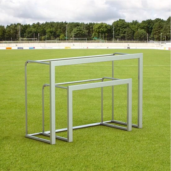 Für alle, die Mehrzweckflächen als Fußballfeld nutzen und wenig Abstellraum zur Verfügung haben, sind die zerlegbaren Mini-Tore die optimale Lösung. Jedes Mini-Tor besteht aus zwei komplett verschweißten Seitenteilen (je aus Torpfosten, seitlichem Bodenrahmen und Netzbügel) sowie Latte, hinterem Bodenrahmen und Netzbügelstrebe. Die Mini-Tore sind demnach teilverschweißtTorlatte und Bodenrahmenstange sind mit den verschweißten Torseitenteilen (Pfosten und Netzbügel) verschraubt. Dadurch entstehen geringere Versandkosten im Vergleich zu vollverschweißten Toren. und werden mit wenigen Handgriffen zu stabilen Freizeittoren für Spiel und Training zusammengebaut. Mit nur sechs Schrauben verbunden, lassen sie sich nach dem Spielen ebenso schnell wieder auseinanderbauen und extrem platzsparend lagern. Bei aller Handlichkeit sind die Mini-Tore extrem stabil und sicher, das zeigt auch das GS-Zeichen.