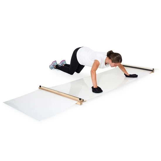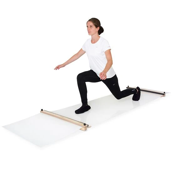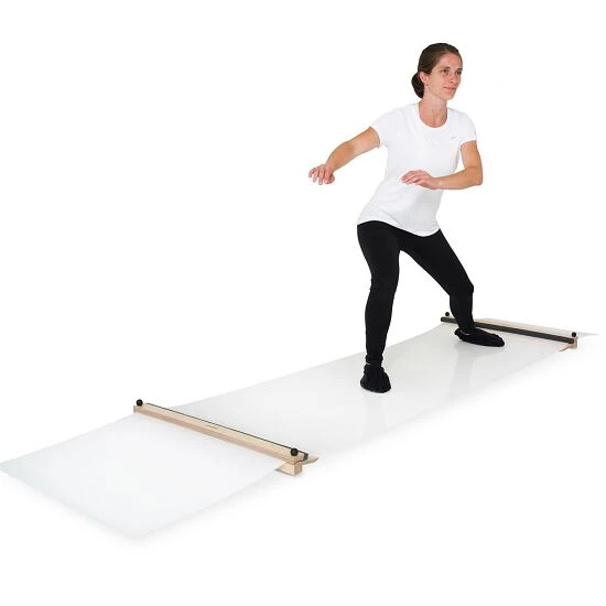 Das Pedalo Slide-X 300 ist ein Trainingsgerät zur Verbesserung der Schnellkraft bei Seitwärtsbewegungen. Trainiert wird mit Gleit-Überschuhen auf einer glatten Kunststoffoberfläche. Die Gleitfähigkeit lässt sich mit einer speziellen Politur je nach Anforderungen verändern. An den Seiten der Fläche sind stabile Stopper angebracht, die den Abstoßimpuls einleiten. Eine weiche Polsterung sorgt für einen weichen Anschlag, wenn die Füße dagegen stoßen. Der Fußanschlag ist schräg ansteigend und lässt sich bis 3 m stufenlos verstellen. Durch Antirutschstreifen bleibt die Bahn bei allen Übungen fest am Platz. Das Slide-X kann nach Gebrauch aufgerollt und mit dem beiliegenden Klettgurt fixiert werden.