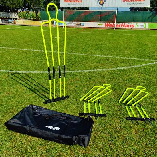 Das Power Shot Fußball-Dummy-Set „Zerlegbar“ beinhaltet 3 Dummys aus festem Kunststoff, welcher leicht, flexibel und stoßdämpfend ist. Das Federgelenk absorbiert den Aufprall des Balles hervorragend und 4 Stahlpins sorgen für die optimale Standsicherheit. Durch die praktische Setgröße üben Sie jederzeit verschiedene Spielsituationen mit den Spielern, können Dummys entfernen und gleichzeitig ein individuelles Torwarttraining durchführen. Besonders praktisch: Dank mitgelieferter Tasche ist der Dummy nach dem Training schnell verstaut und lässt sich leicht transportieren.