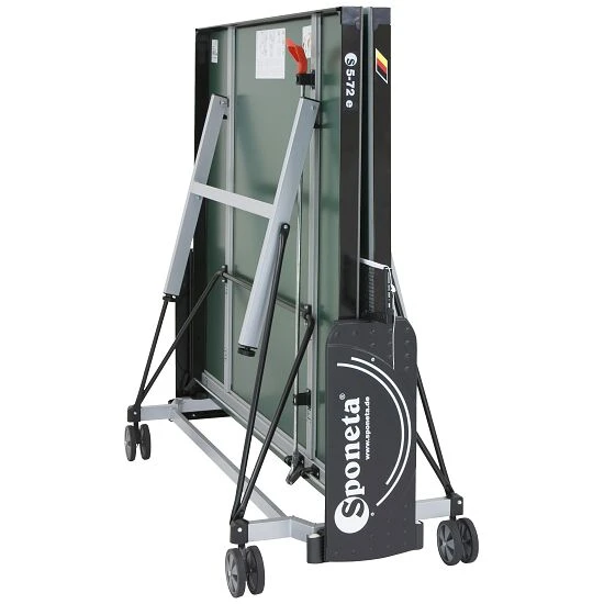 Die Sponeta Tischtennisplatte „S 5-72 e / S 5-73 e“ eignet sich speziell für den Einsatz im Außenbereich von Schule und Freizeiteinrichtung. Seine 6 mm starke Melaminharzplatte ist resistent gegen Feuchtigkeit und fest mit der Metallunterkonstruktion verklebt. Zusätzlich verfügt die Platte über ein Compact-Untergestell, welches mit seiner einfachen Handhabung punktet. Jede Plattenhälfte kann unabhängig voneinander herunter- bzw. hochgeklappt werden. So ist der Tischtennistisch mit wenigen Handgriffen sofort einsatzbereit. Durch vier gummierte Doppelräder fahren Sie die TT-Platte schnell und bequem zum nächsten Spielort. Für einen optimalen Stand sorgt der praktische Höhenausgleich an den äußeren Beinen. Dank dieser Funktion gleichen Sie Unebenheiten von bis zu 30 mm aus.