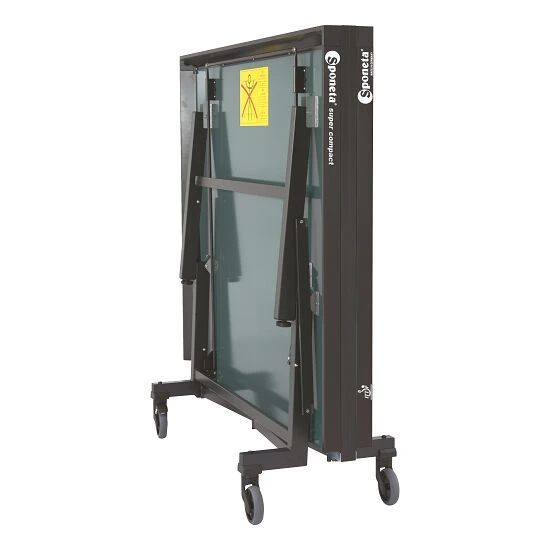 Die Sponeta Tischtennisplatte “S 8-36 / S 8-37” verfügt über ein Bügel-Sicherheitssystem. Durch beidhändiges Betätigen des Metallbügels unterhalb der Plattenoberfläche werden die linke und rechte Verriegelung gleichzeitig gelöst. Somit lässt sich der Tisch bequem und schnell auch von einer Person aufstellen. Zum Lieferumfang gehört eine ITTF