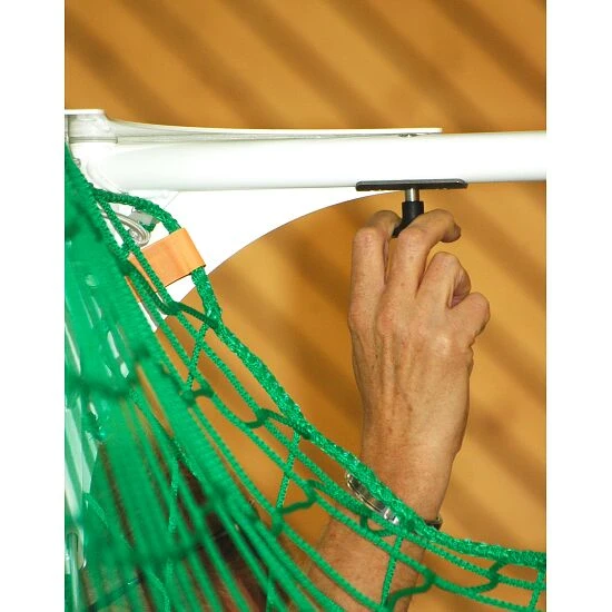Durch die im Netzbügel eingebaute Rastmechanik, wird der Verlust bzw. das Verbiegen oder Abbrechen der herkömmlichen Netzbügelstreben verhindert. Bei den Handballtoren in anklappbarer Ausführung sind Kunststoff-Gleitlager verbaut. Hier wurde darauf geachtet, dass keine metallischen Gegenstände aneinander reiben und somit die Befestigungspunkte ausschlagen.