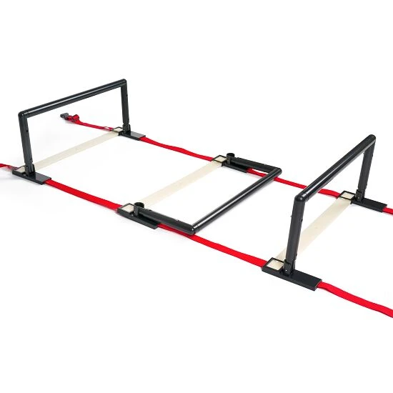 Die Sport-Thieme Hürden- und Koordinationsleiter, höhenverstellbar überzeugt durch ihre 2 in 1 – Funktion. Das Trainingsgerät besteht aus 2 Seilen, welche sich gegenüber liegen. An den Streben, welche Sie für das Koordinationsleiter-Training nutzen, sind auch die Hürden befestigt. Besonders praktisch: Sie lassen sich individuell im Abstand zueinander einstellen und für den Nichtgebrauch leicht umklappen. Ein weiterer Vorteil stellt die 3-fach Höhenverstellung dar – dank ihr gestalten Sie das Training für die Trainierenden abwechslungsreich und herausfordernd. Nach der Übung falten Sie die Hürden- und Koordinationsleiter platzsparend zusammen und transportieren sie mittels Nylontasche oder praktischem Tragegriff.