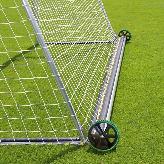 Das Sport-Thieme Kleinfeldtor „Safety“ mit PlayersProtect vereint eine besonders hohe Produktsicherheit mit bester Haltbarkeit und einfacher Handhabung. Das vollverschweißte Tor ist aus stabilem AluminiumAluminium ist ein korrosionsbeständiges und pflegeleichtes Leichtmetall, welches für den vielfältigen Einsatz im Innen- und Außenbereich geeignet ist. Aufgrund der hohen Elastizität und des nur geringen Gewichts, ist es eines der am häufigsten verwendeten Gebrauchsmaterialien. gefertigt und ist dank stahlverstärkten Ecken besonders robust. Der hintere Bodenrahmen lässt sich mit Quarzsand füllen und sichert das Tor zuverlässig gegen Umkippen. Dank breiter Transporträder ist das Kleinfeldtor auch in gefülltem Zustand leicht zu bewegen und bleibt mobil. Ein weiteres Plus an Sicherheit bietet der einzigartige PlayersProtect Aufprallschutz im Bodenrahmen.