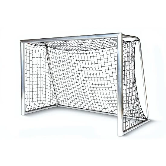 Das Tor kommt mit einem Latten/Pfostenprofil von 120×100 mm und ist transportabel. Der Bodenrahmen im Systemprofil (75×40 mm) und bodenlanger Netzbügel (ø 40×4 mm) komplementieren das Kleinfeldtor.
