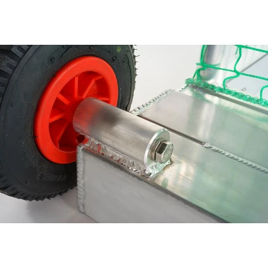 Damit Minitore die gesetzlich geforderte Kippsicherung erreichen oder den Transport erleichtern – überzeugt das Sport-Thieme Mini-Trainingstor als Komplettlösung. Zum einen lässt sich das Bodenrohr des Tores mit Quarzsand befüllen, sodass es ein hohes Eigengewicht erhält und nicht umkippen kann. Zum anderen befinden sich im hinteren Bereiches des abgerundeten Bodenrohres 2 aufgeschweißte Buchsen, die als Halterung der Räder dienen. Diese Räder sind aus PU-Schaum gefertigt, verlieren keine Luft und lassen sich dank groben Profil auch auf weichen Untergründen fahren.