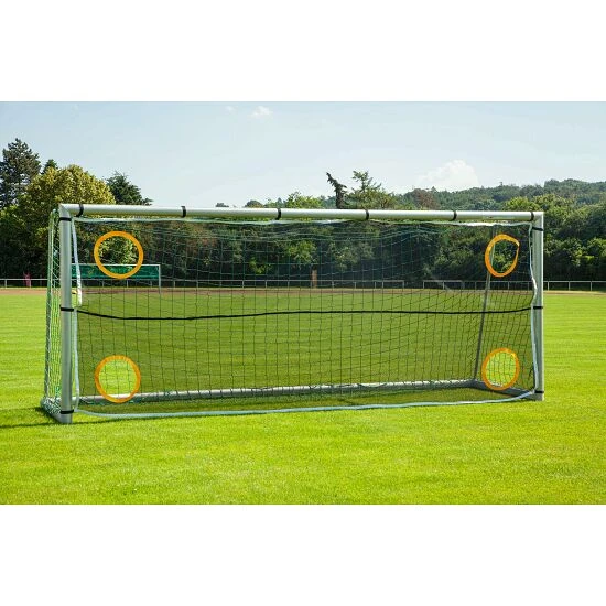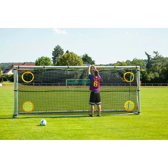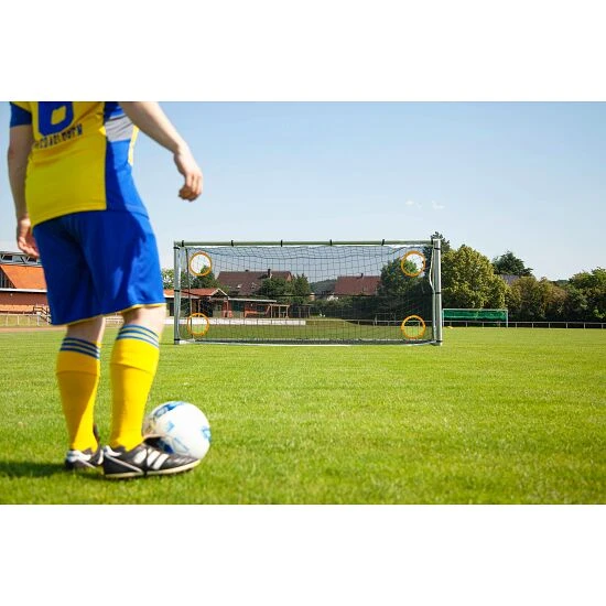 Das Sport-Thieme Torwandnetz ist ein gutes Zubehör für das Fußballtraining in der Schule oder dem Verein. Das Netz ist aus PolyesterPolyester ist eine sehr pflegeleichte Kunstfaser. Schnell trocknend und besonders reißfest. gefertigt, sehr robust und winddurchlässig. Es verfügt über Klettbänder und lässt sich mit wenigen Handgriffen an jedem Fußballtor 5×2 m befestigen. Die 4 Torschusslöcher haben einen Durchmesser von ca. 40 cm, sind am Rand verstärkt und halten selbst härtesten Schüssen stand.
